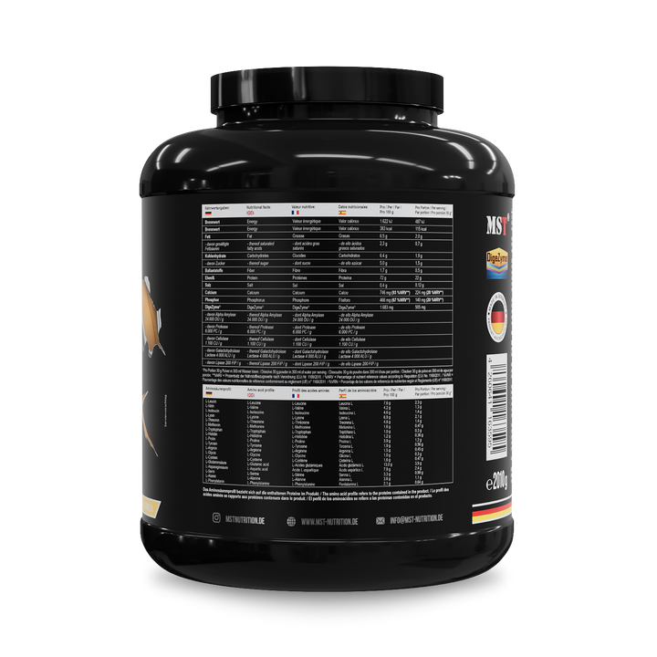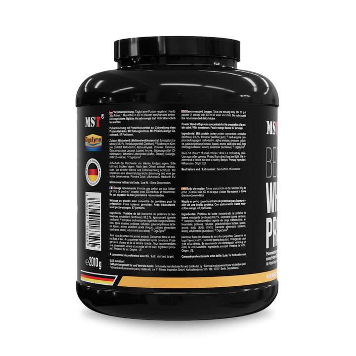 Entdecken Sie das ultimative Protein-Erlebnis mit MST® BEST Whey Protein Mango Peach 2010 g, ergänzt mit DigeZyme® - eine erfrischende Kombination, die Ihren Körper mit hochwertigem Protein und Verdauungsenzymen versorgt.