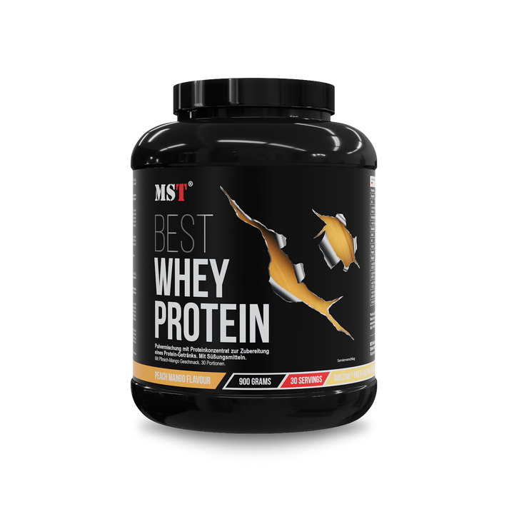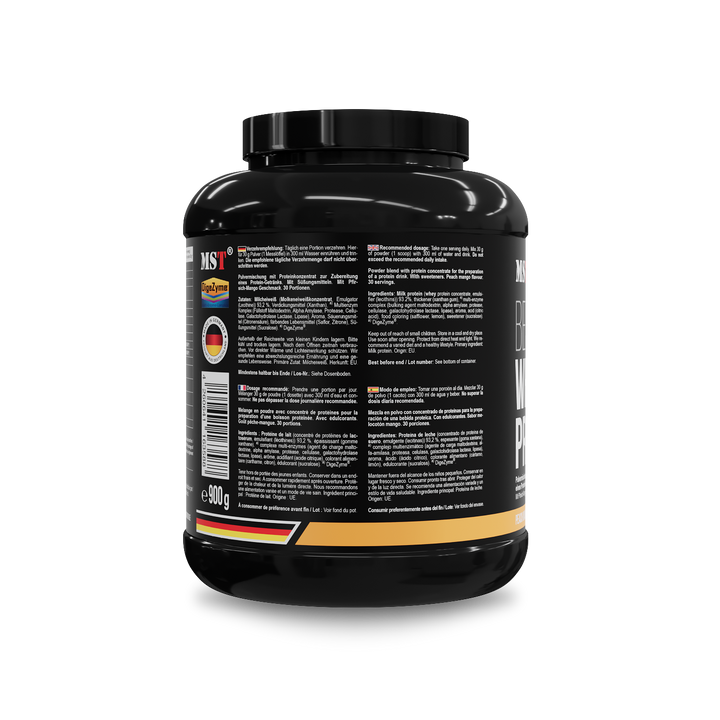 Entdecken Sie das ultimative Protein-Erlebnis mit MST® BEST Whey Protein Peach Mango 900 g, ergänzt mit DigeZyme® - eine erfrischende Kombination, die Ihren Körper mit hochwertigem Protein und Verdauungsenzymen versorgt. Hier sind einige der einzigartigen Vorteile dieses Produkts: